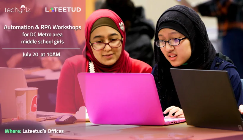 Lateetud & TechGirlz organize Automation & RPA Workshops for DC Metro area middle school girls on July 20 at 10 am EST at Lateetud's premises....